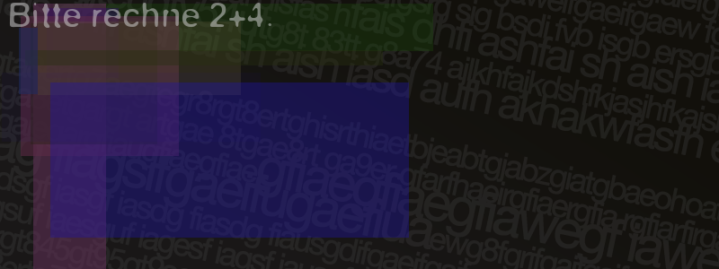 Die Visuelle Bestätigung hilft dabei automatische Spambots und Scripte von den Diensten dieses Forums abzuhalten. Derartige Scripte sind normalerweise nicht in der Lage den untenstehenden Code zu erkennen. Bitte geben Sie also in das untenstehende Feld die Buchstaben und Zahlen ein, die Sie in dem Bild erkennen können oder beantworten Sie die angezeigte Frage.