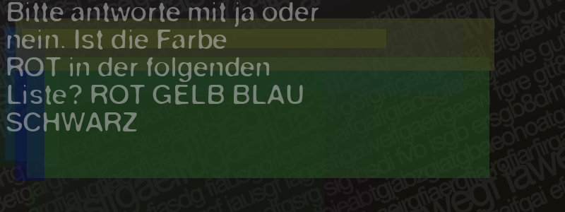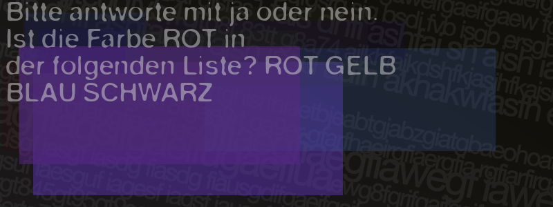 Die Visuelle Bestätigung hilft dabei automatische Spambots und Scripte von den Diensten dieses Forums abzuhalten. Derartige Scripte sind normalerweise nicht in der Lage den untenstehenden Code zu erkennen. Bitte geben Sie also in das untenstehende Feld die Buchstaben und Zahlen ein, die Sie in dem Bild erkennen können oder beantworten Sie die angezeigte Frage.