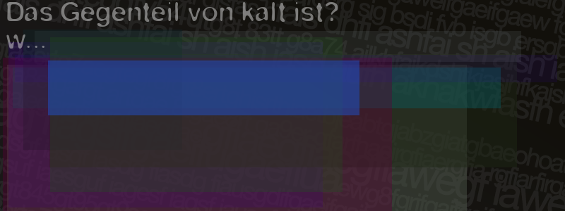 Die Visuelle Bestätigung hilft dabei automatische Spambots und Scripte von den Diensten dieses Forums abzuhalten. Derartige Scripte sind normalerweise nicht in der Lage den untenstehenden Code zu erkennen. Bitte geben Sie also in das untenstehende Feld die Buchstaben und Zahlen ein, die Sie in dem Bild erkennen können oder beantworten Sie die angezeigte Frage.