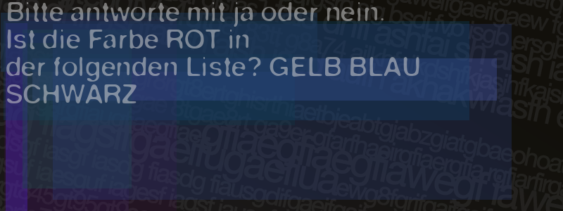 Die Visuelle Bestätigung hilft dabei automatische Spambots und Scripte von den Diensten dieses Forums abzuhalten. Derartige Scripte sind normalerweise nicht in der Lage den untenstehenden Code zu erkennen. Bitte geben Sie also in das untenstehende Feld die Buchstaben und Zahlen ein, die Sie in dem Bild erkennen können oder beantworten Sie die angezeigte Frage.