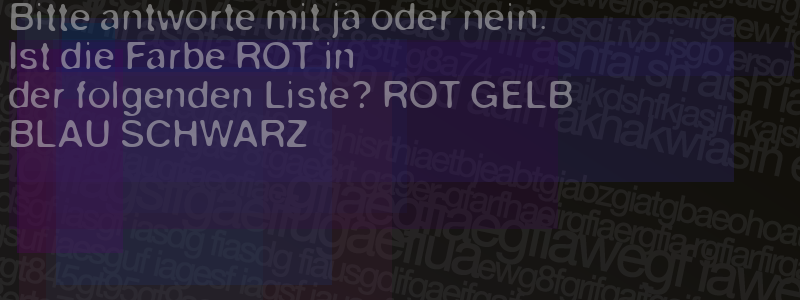 Die Visuelle Bestätigung hilft dabei automatische Spambots und Scripte von den Diensten dieses Forums abzuhalten. Derartige Scripte sind normalerweise nicht in der Lage den untenstehenden Code zu erkennen. Bitte geben Sie also in das untenstehende Feld die Buchstaben und Zahlen ein, die Sie in dem Bild erkennen können oder beantworten Sie die angezeigte Frage.