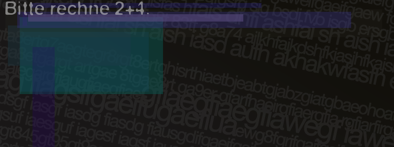 Die Visuelle Bestätigung hilft dabei automatische Spambots und Scripte von den Diensten dieses Forums abzuhalten. Derartige Scripte sind normalerweise nicht in der Lage den untenstehenden Code zu erkennen. Bitte geben Sie also in das untenstehende Feld die Buchstaben und Zahlen ein, die Sie in dem Bild erkennen können oder beantworten Sie die angezeigte Frage.