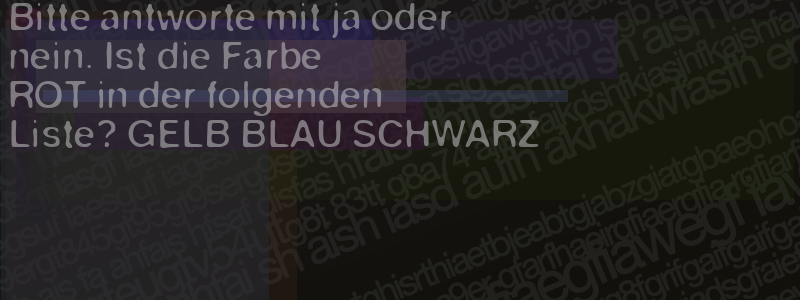 Die Visuelle Bestätigung hilft dabei automatische Spambots und Scripte von den Diensten dieses Forums abzuhalten. Derartige Scripte sind normalerweise nicht in der Lage den untenstehenden Code zu erkennen. Bitte geben Sie also in das untenstehende Feld die Buchstaben und Zahlen ein, die Sie in dem Bild erkennen können oder beantworten Sie die angezeigte Frage.