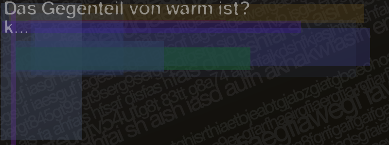 Die Visuelle Bestätigung hilft dabei automatische Spambots und Scripte von den Diensten dieses Forums abzuhalten. Derartige Scripte sind normalerweise nicht in der Lage den untenstehenden Code zu erkennen. Bitte geben Sie also in das untenstehende Feld die Buchstaben und Zahlen ein, die Sie in dem Bild erkennen können oder beantworten Sie die angezeigte Frage.