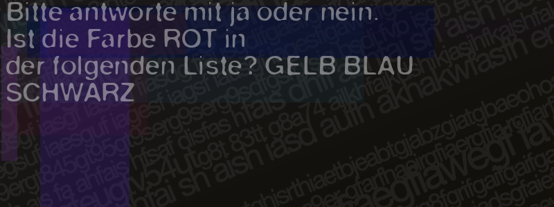 Die Visuelle Bestätigung hilft dabei automatische Spambots und Scripte von den Diensten dieses Forums abzuhalten. Derartige Scripte sind normalerweise nicht in der Lage den untenstehenden Code zu erkennen. Bitte geben Sie also in das untenstehende Feld die Buchstaben und Zahlen ein, die Sie in dem Bild erkennen können oder beantworten Sie die angezeigte Frage.