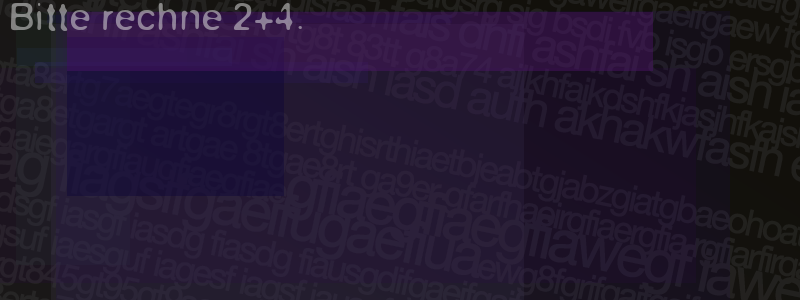 Die Visuelle Bestätigung hilft dabei automatische Spambots und Scripte von den Diensten dieses Forums abzuhalten. Derartige Scripte sind normalerweise nicht in der Lage den untenstehenden Code zu erkennen. Bitte geben Sie also in das untenstehende Feld die Buchstaben und Zahlen ein, die Sie in dem Bild erkennen können oder beantworten Sie die angezeigte Frage.