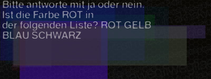 Die Visuelle Bestätigung hilft dabei automatische Spambots und Scripte von den Diensten dieses Forums abzuhalten. Derartige Scripte sind normalerweise nicht in der Lage den untenstehenden Code zu erkennen. Bitte geben Sie also in das untenstehende Feld die Buchstaben und Zahlen ein, die Sie in dem Bild erkennen können oder beantworten Sie die angezeigte Frage.