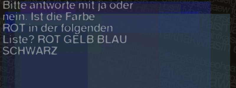 Die Visuelle Bestätigung hilft dabei automatische Spambots und Scripte von den Diensten dieses Forums abzuhalten. Derartige Scripte sind normalerweise nicht in der Lage den untenstehenden Code zu erkennen. Bitte geben Sie also in das untenstehende Feld die Buchstaben und Zahlen ein, die Sie in dem Bild erkennen können oder beantworten Sie die angezeigte Frage.