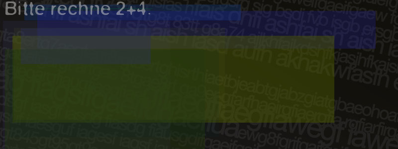 Die Visuelle Bestätigung hilft dabei automatische Spambots und Scripte von den Diensten dieses Forums abzuhalten. Derartige Scripte sind normalerweise nicht in der Lage den untenstehenden Code zu erkennen. Bitte geben Sie also in das untenstehende Feld die Buchstaben und Zahlen ein, die Sie in dem Bild erkennen können oder beantworten Sie die angezeigte Frage.