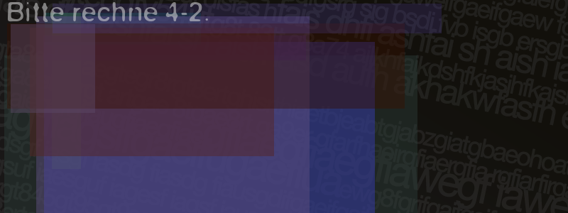 Die Visuelle Bestätigung hilft dabei automatische Spambots und Scripte von den Diensten dieses Forums abzuhalten. Derartige Scripte sind normalerweise nicht in der Lage den untenstehenden Code zu erkennen. Bitte geben Sie also in das untenstehende Feld die Buchstaben und Zahlen ein, die Sie in dem Bild erkennen können oder beantworten Sie die angezeigte Frage.