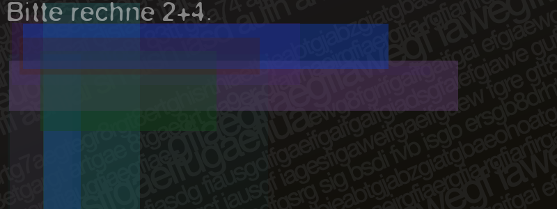 Die Visuelle Bestätigung hilft dabei automatische Spambots und Scripte von den Diensten dieses Forums abzuhalten. Derartige Scripte sind normalerweise nicht in der Lage den untenstehenden Code zu erkennen. Bitte geben Sie also in das untenstehende Feld die Buchstaben und Zahlen ein, die Sie in dem Bild erkennen können oder beantworten Sie die angezeigte Frage.