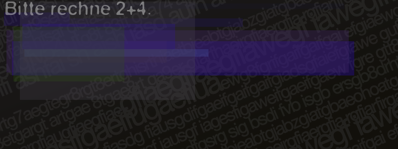 Die Visuelle Bestätigung hilft dabei automatische Spambots und Scripte von den Diensten dieses Forums abzuhalten. Derartige Scripte sind normalerweise nicht in der Lage den untenstehenden Code zu erkennen. Bitte geben Sie also in das untenstehende Feld die Buchstaben und Zahlen ein, die Sie in dem Bild erkennen können oder beantworten Sie die angezeigte Frage.