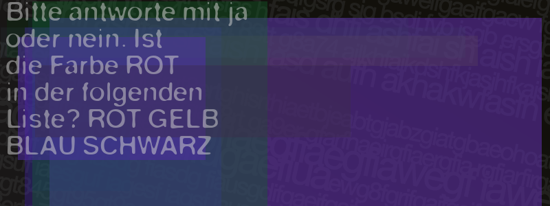 Die Visuelle Bestätigung hilft dabei automatische Spambots und Scripte von den Diensten dieses Forums abzuhalten. Derartige Scripte sind normalerweise nicht in der Lage den untenstehenden Code zu erkennen. Bitte geben Sie also in das untenstehende Feld die Buchstaben und Zahlen ein, die Sie in dem Bild erkennen können oder beantworten Sie die angezeigte Frage.
