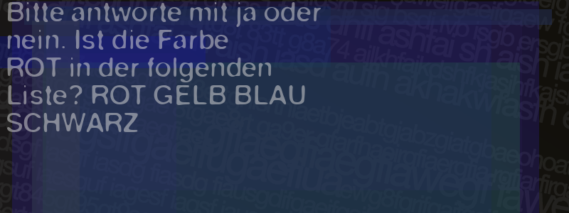 Die Visuelle Bestätigung hilft dabei automatische Spambots und Scripte von den Diensten dieses Forums abzuhalten. Derartige Scripte sind normalerweise nicht in der Lage den untenstehenden Code zu erkennen. Bitte geben Sie also in das untenstehende Feld die Buchstaben und Zahlen ein, die Sie in dem Bild erkennen können oder beantworten Sie die angezeigte Frage.
