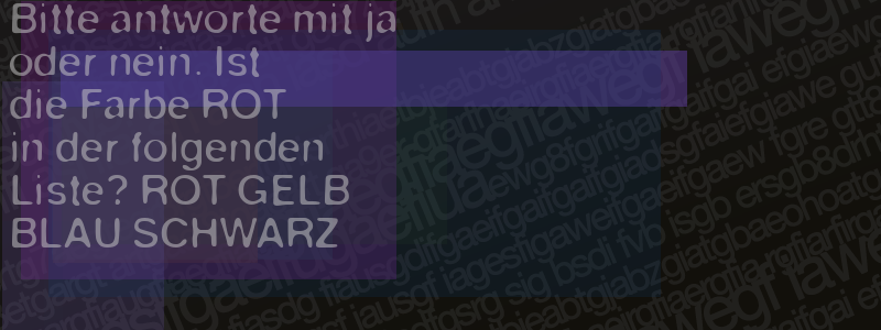 Die Visuelle Bestätigung hilft dabei automatische Spambots und Scripte von den Diensten dieses Forums abzuhalten. Derartige Scripte sind normalerweise nicht in der Lage den untenstehenden Code zu erkennen. Bitte geben Sie also in das untenstehende Feld die Buchstaben und Zahlen ein, die Sie in dem Bild erkennen können oder beantworten Sie die angezeigte Frage.