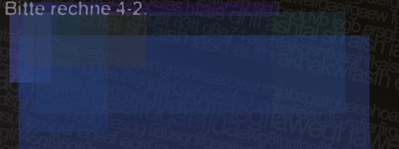 Die Visuelle Bestätigung hilft dabei automatische Spambots und Scripte von den Diensten dieses Forums abzuhalten. Derartige Scripte sind normalerweise nicht in der Lage den untenstehenden Code zu erkennen. Bitte geben Sie also in das untenstehende Feld die Buchstaben und Zahlen ein, die Sie in dem Bild erkennen können oder beantworten Sie die angezeigte Frage.