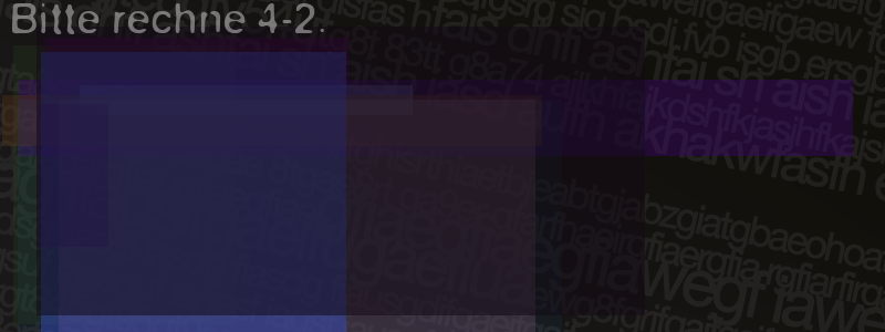 Die Visuelle Bestätigung hilft dabei automatische Spambots und Scripte von den Diensten dieses Forums abzuhalten. Derartige Scripte sind normalerweise nicht in der Lage den untenstehenden Code zu erkennen. Bitte geben Sie also in das untenstehende Feld die Buchstaben und Zahlen ein, die Sie in dem Bild erkennen können oder beantworten Sie die angezeigte Frage.