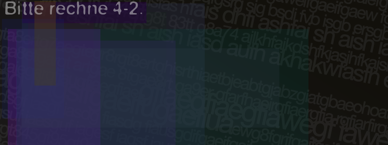 Die Visuelle Bestätigung hilft dabei automatische Spambots und Scripte von den Diensten dieses Forums abzuhalten. Derartige Scripte sind normalerweise nicht in der Lage den untenstehenden Code zu erkennen. Bitte geben Sie also in das untenstehende Feld die Buchstaben und Zahlen ein, die Sie in dem Bild erkennen können oder beantworten Sie die angezeigte Frage.