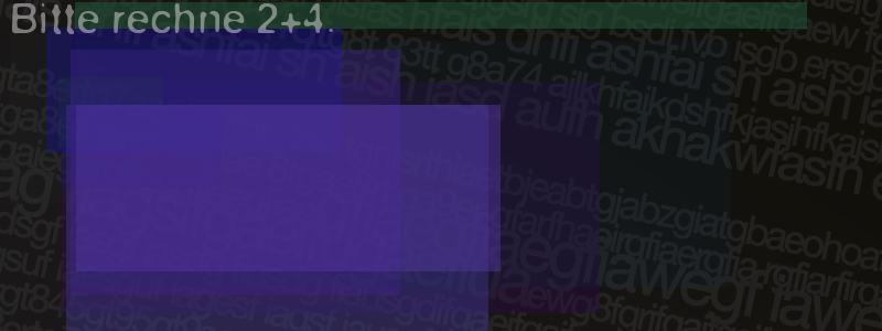 Die Visuelle Bestätigung hilft dabei automatische Spambots und Scripte von den Diensten dieses Forums abzuhalten. Derartige Scripte sind normalerweise nicht in der Lage den untenstehenden Code zu erkennen. Bitte geben Sie also in das untenstehende Feld die Buchstaben und Zahlen ein, die Sie in dem Bild erkennen können oder beantworten Sie die angezeigte Frage.