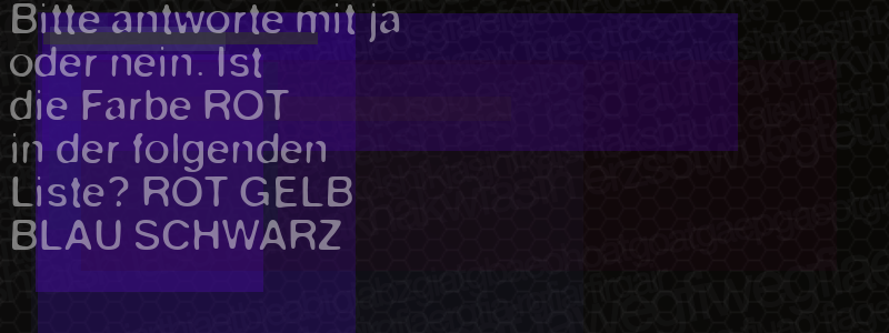 Die Visuelle Bestätigung hilft dabei automatische Spambots und Scripte von den Diensten dieses Forums abzuhalten. Derartige Scripte sind normalerweise nicht in der Lage den untenstehenden Code zu erkennen. Bitte geben Sie also in das untenstehende Feld die Buchstaben und Zahlen ein, die Sie in dem Bild erkennen können oder beantworten Sie die angezeigte Frage.