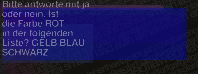 Die Visuelle Bestätigung hilft dabei automatische Spambots und Scripte von den Diensten dieses Forums abzuhalten. Derartige Scripte sind normalerweise nicht in der Lage den untenstehenden Code zu erkennen. Bitte geben Sie also in das untenstehende Feld die Buchstaben und Zahlen ein, die Sie in dem Bild erkennen können oder beantworten Sie die angezeigte Frage.