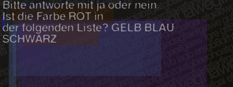 Die Visuelle Bestätigung hilft dabei automatische Spambots und Scripte von den Diensten dieses Forums abzuhalten. Derartige Scripte sind normalerweise nicht in der Lage den untenstehenden Code zu erkennen. Bitte geben Sie also in das untenstehende Feld die Buchstaben und Zahlen ein, die Sie in dem Bild erkennen können oder beantworten Sie die angezeigte Frage.