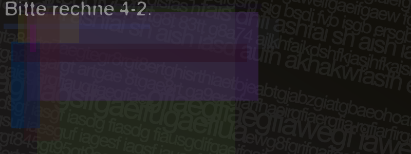 Die Visuelle Bestätigung hilft dabei automatische Spambots und Scripte von den Diensten dieses Forums abzuhalten. Derartige Scripte sind normalerweise nicht in der Lage den untenstehenden Code zu erkennen. Bitte geben Sie also in das untenstehende Feld die Buchstaben und Zahlen ein, die Sie in dem Bild erkennen können oder beantworten Sie die angezeigte Frage.
