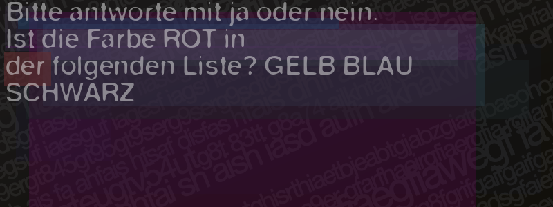 Die Visuelle Bestätigung hilft dabei automatische Spambots und Scripte von den Diensten dieses Forums abzuhalten. Derartige Scripte sind normalerweise nicht in der Lage den untenstehenden Code zu erkennen. Bitte geben Sie also in das untenstehende Feld die Buchstaben und Zahlen ein, die Sie in dem Bild erkennen können oder beantworten Sie die angezeigte Frage.