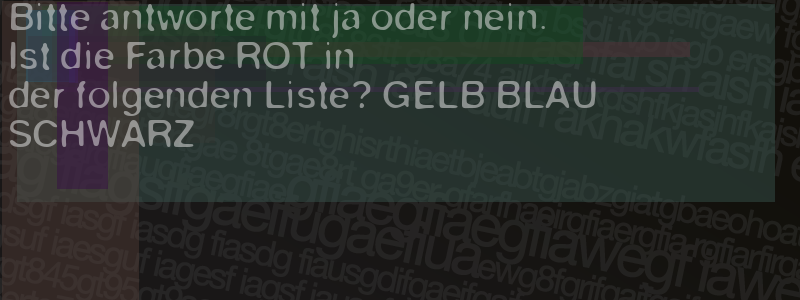 Die Visuelle Bestätigung hilft dabei automatische Spambots und Scripte von den Diensten dieses Forums abzuhalten. Derartige Scripte sind normalerweise nicht in der Lage den untenstehenden Code zu erkennen. Bitte geben Sie also in das untenstehende Feld die Buchstaben und Zahlen ein, die Sie in dem Bild erkennen können oder beantworten Sie die angezeigte Frage.