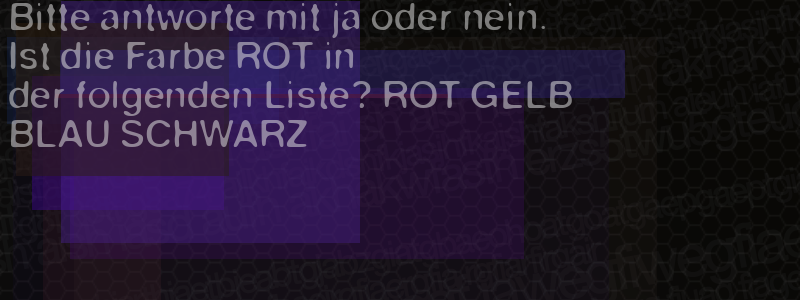 Die Visuelle Bestätigung hilft dabei automatische Spambots und Scripte von den Diensten dieses Forums abzuhalten. Derartige Scripte sind normalerweise nicht in der Lage den untenstehenden Code zu erkennen. Bitte geben Sie also in das untenstehende Feld die Buchstaben und Zahlen ein, die Sie in dem Bild erkennen können oder beantworten Sie die angezeigte Frage.