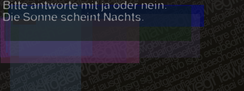 Die Visuelle Bestätigung hilft dabei automatische Spambots und Scripte von den Diensten dieses Forums abzuhalten. Derartige Scripte sind normalerweise nicht in der Lage den untenstehenden Code zu erkennen. Bitte geben Sie also in das untenstehende Feld die Buchstaben und Zahlen ein, die Sie in dem Bild erkennen können oder beantworten Sie die angezeigte Frage.