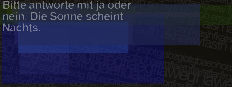 Die Visuelle Bestätigung hilft dabei automatische Spambots und Scripte von den Diensten dieses Forums abzuhalten. Derartige Scripte sind normalerweise nicht in der Lage den untenstehenden Code zu erkennen. Bitte geben Sie also in das untenstehende Feld die Buchstaben und Zahlen ein, die Sie in dem Bild erkennen können oder beantworten Sie die angezeigte Frage.
