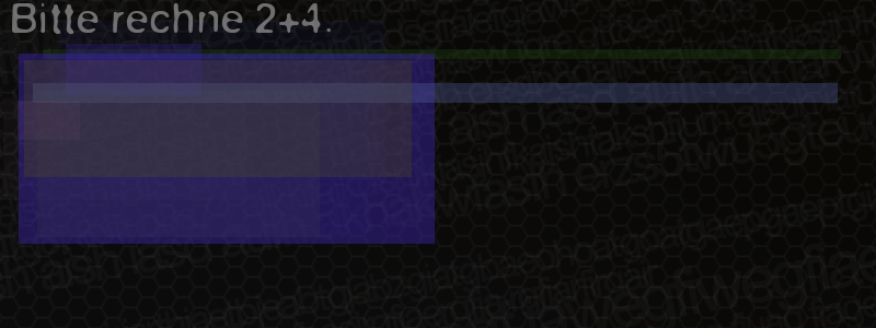 Die Visuelle Bestätigung hilft dabei automatische Spambots und Scripte von den Diensten dieses Forums abzuhalten. Derartige Scripte sind normalerweise nicht in der Lage den untenstehenden Code zu erkennen. Bitte geben Sie also in das untenstehende Feld die Buchstaben und Zahlen ein, die Sie in dem Bild erkennen können oder beantworten Sie die angezeigte Frage.