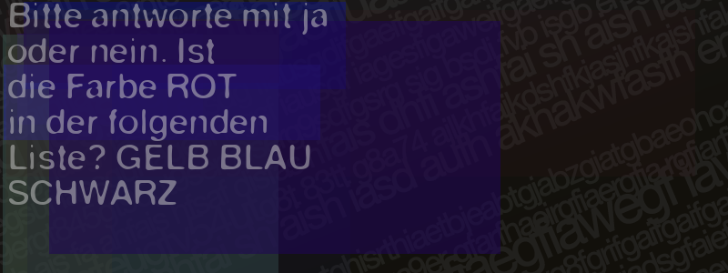 Die Visuelle Bestätigung hilft dabei automatische Spambots und Scripte von den Diensten dieses Forums abzuhalten. Derartige Scripte sind normalerweise nicht in der Lage den untenstehenden Code zu erkennen. Bitte geben Sie also in das untenstehende Feld die Buchstaben und Zahlen ein, die Sie in dem Bild erkennen können oder beantworten Sie die angezeigte Frage.
