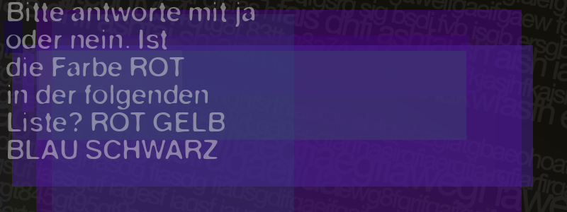 Die Visuelle Bestätigung hilft dabei automatische Spambots und Scripte von den Diensten dieses Forums abzuhalten. Derartige Scripte sind normalerweise nicht in der Lage den untenstehenden Code zu erkennen. Bitte geben Sie also in das untenstehende Feld die Buchstaben und Zahlen ein, die Sie in dem Bild erkennen können oder beantworten Sie die angezeigte Frage.
