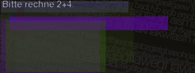 Die Visuelle Bestätigung hilft dabei automatische Spambots und Scripte von den Diensten dieses Forums abzuhalten. Derartige Scripte sind normalerweise nicht in der Lage den untenstehenden Code zu erkennen. Bitte geben Sie also in das untenstehende Feld die Buchstaben und Zahlen ein, die Sie in dem Bild erkennen können oder beantworten Sie die angezeigte Frage.
