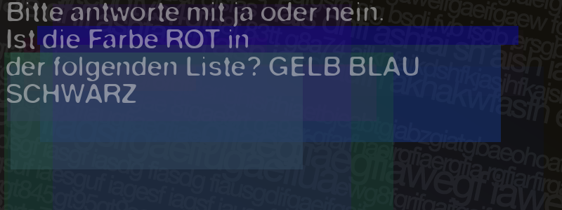 Die Visuelle Bestätigung hilft dabei automatische Spambots und Scripte von den Diensten dieses Forums abzuhalten. Derartige Scripte sind normalerweise nicht in der Lage den untenstehenden Code zu erkennen. Bitte geben Sie also in das untenstehende Feld die Buchstaben und Zahlen ein, die Sie in dem Bild erkennen können oder beantworten Sie die angezeigte Frage.