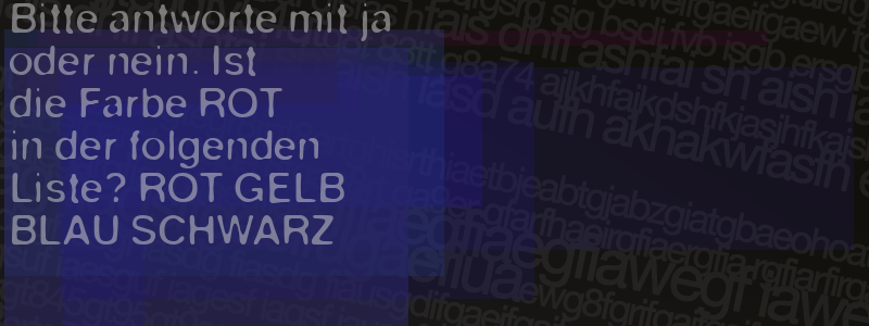 Die Visuelle Bestätigung hilft dabei automatische Spambots und Scripte von den Diensten dieses Forums abzuhalten. Derartige Scripte sind normalerweise nicht in der Lage den untenstehenden Code zu erkennen. Bitte geben Sie also in das untenstehende Feld die Buchstaben und Zahlen ein, die Sie in dem Bild erkennen können oder beantworten Sie die angezeigte Frage.