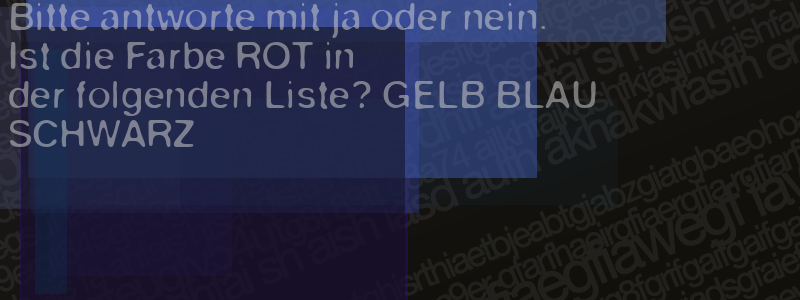 Die Visuelle Bestätigung hilft dabei automatische Spambots und Scripte von den Diensten dieses Forums abzuhalten. Derartige Scripte sind normalerweise nicht in der Lage den untenstehenden Code zu erkennen. Bitte geben Sie also in das untenstehende Feld die Buchstaben und Zahlen ein, die Sie in dem Bild erkennen können oder beantworten Sie die angezeigte Frage.