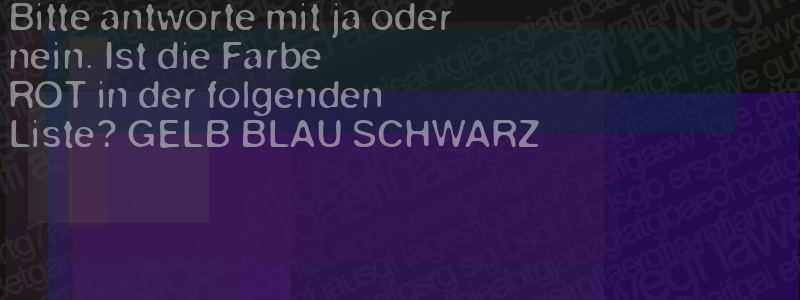 Die Visuelle Bestätigung hilft dabei automatische Spambots und Scripte von den Diensten dieses Forums abzuhalten. Derartige Scripte sind normalerweise nicht in der Lage den untenstehenden Code zu erkennen. Bitte geben Sie also in das untenstehende Feld die Buchstaben und Zahlen ein, die Sie in dem Bild erkennen können oder beantworten Sie die angezeigte Frage.