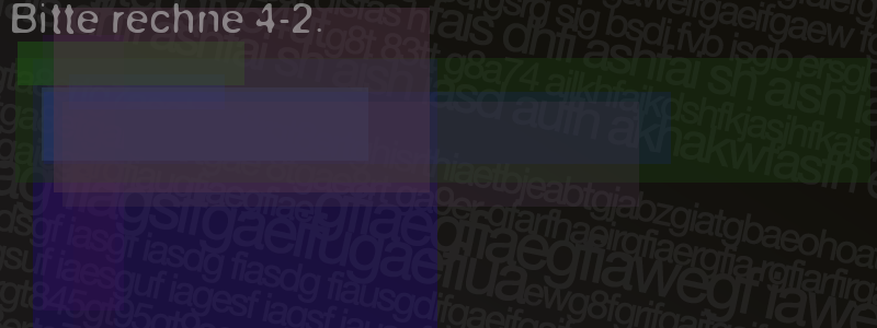 Die Visuelle Bestätigung hilft dabei automatische Spambots und Scripte von den Diensten dieses Forums abzuhalten. Derartige Scripte sind normalerweise nicht in der Lage den untenstehenden Code zu erkennen. Bitte geben Sie also in das untenstehende Feld die Buchstaben und Zahlen ein, die Sie in dem Bild erkennen können oder beantworten Sie die angezeigte Frage.