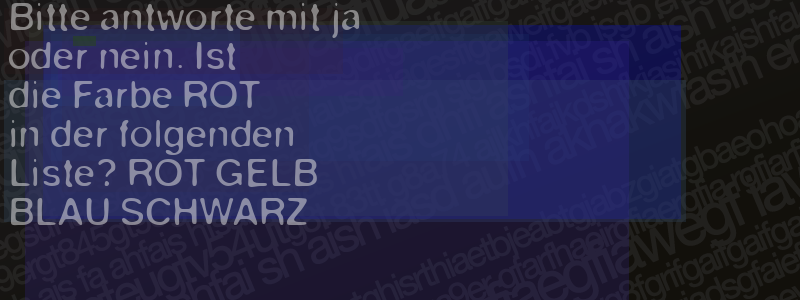 Die Visuelle Bestätigung hilft dabei automatische Spambots und Scripte von den Diensten dieses Forums abzuhalten. Derartige Scripte sind normalerweise nicht in der Lage den untenstehenden Code zu erkennen. Bitte geben Sie also in das untenstehende Feld die Buchstaben und Zahlen ein, die Sie in dem Bild erkennen können oder beantworten Sie die angezeigte Frage.