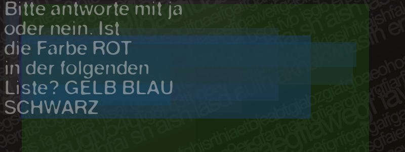 Die Visuelle Bestätigung hilft dabei automatische Spambots und Scripte von den Diensten dieses Forums abzuhalten. Derartige Scripte sind normalerweise nicht in der Lage den untenstehenden Code zu erkennen. Bitte geben Sie also in das untenstehende Feld die Buchstaben und Zahlen ein, die Sie in dem Bild erkennen können oder beantworten Sie die angezeigte Frage.