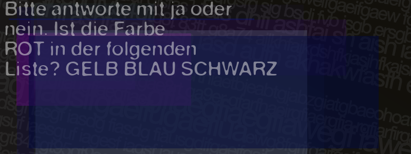 Die Visuelle Bestätigung hilft dabei automatische Spambots und Scripte von den Diensten dieses Forums abzuhalten. Derartige Scripte sind normalerweise nicht in der Lage den untenstehenden Code zu erkennen. Bitte geben Sie also in das untenstehende Feld die Buchstaben und Zahlen ein, die Sie in dem Bild erkennen können oder beantworten Sie die angezeigte Frage.
