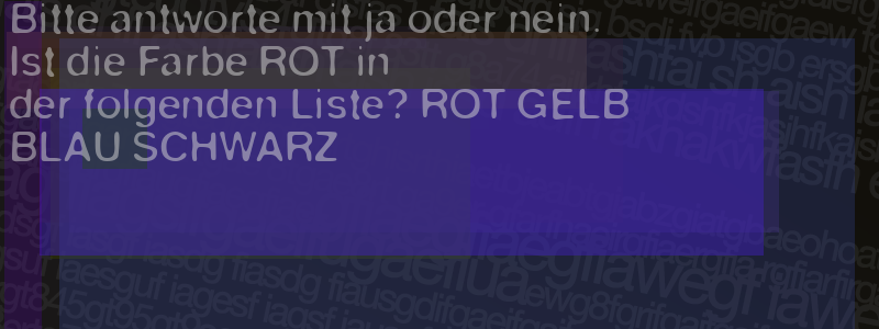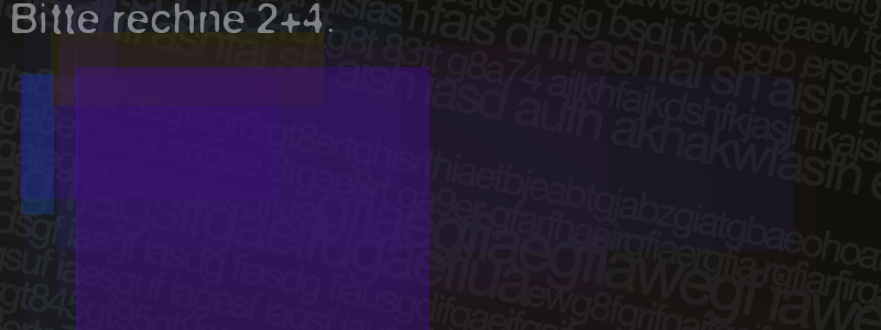 Die Visuelle Bestätigung hilft dabei automatische Spambots und Scripte von den Diensten dieses Forums abzuhalten. Derartige Scripte sind normalerweise nicht in der Lage den untenstehenden Code zu erkennen. Bitte geben Sie also in das untenstehende Feld die Buchstaben und Zahlen ein, die Sie in dem Bild erkennen können oder beantworten Sie die angezeigte Frage.