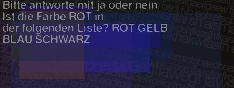 Die Visuelle Bestätigung hilft dabei automatische Spambots und Scripte von den Diensten dieses Forums abzuhalten. Derartige Scripte sind normalerweise nicht in der Lage den untenstehenden Code zu erkennen. Bitte geben Sie also in das untenstehende Feld die Buchstaben und Zahlen ein, die Sie in dem Bild erkennen können oder beantworten Sie die angezeigte Frage.