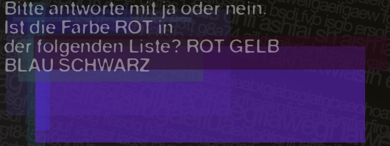Die Visuelle Bestätigung hilft dabei automatische Spambots und Scripte von den Diensten dieses Forums abzuhalten. Derartige Scripte sind normalerweise nicht in der Lage den untenstehenden Code zu erkennen. Bitte geben Sie also in das untenstehende Feld die Buchstaben und Zahlen ein, die Sie in dem Bild erkennen können oder beantworten Sie die angezeigte Frage.