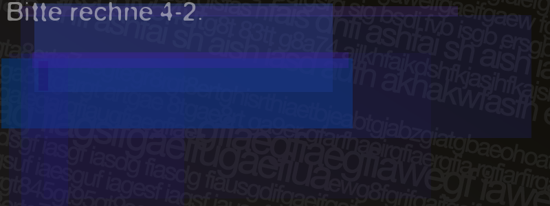 Die Visuelle Bestätigung hilft dabei automatische Spambots und Scripte von den Diensten dieses Forums abzuhalten. Derartige Scripte sind normalerweise nicht in der Lage den untenstehenden Code zu erkennen. Bitte geben Sie also in das untenstehende Feld die Buchstaben und Zahlen ein, die Sie in dem Bild erkennen können oder beantworten Sie die angezeigte Frage.