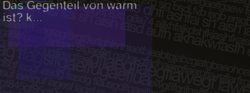 Die Visuelle Bestätigung hilft dabei automatische Spambots und Scripte von den Diensten dieses Forums abzuhalten. Derartige Scripte sind normalerweise nicht in der Lage den untenstehenden Code zu erkennen. Bitte geben Sie also in das untenstehende Feld die Buchstaben und Zahlen ein, die Sie in dem Bild erkennen können oder beantworten Sie die angezeigte Frage.