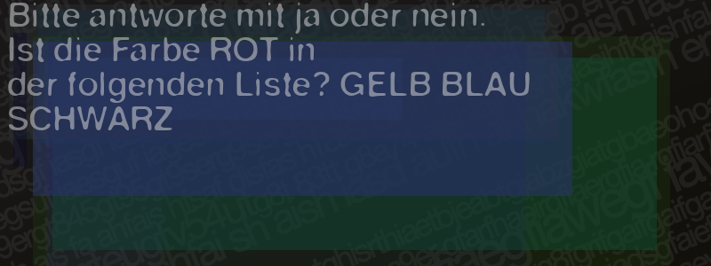 Die Visuelle Bestätigung hilft dabei automatische Spambots und Scripte von den Diensten dieses Forums abzuhalten. Derartige Scripte sind normalerweise nicht in der Lage den untenstehenden Code zu erkennen. Bitte geben Sie also in das untenstehende Feld die Buchstaben und Zahlen ein, die Sie in dem Bild erkennen können oder beantworten Sie die angezeigte Frage.